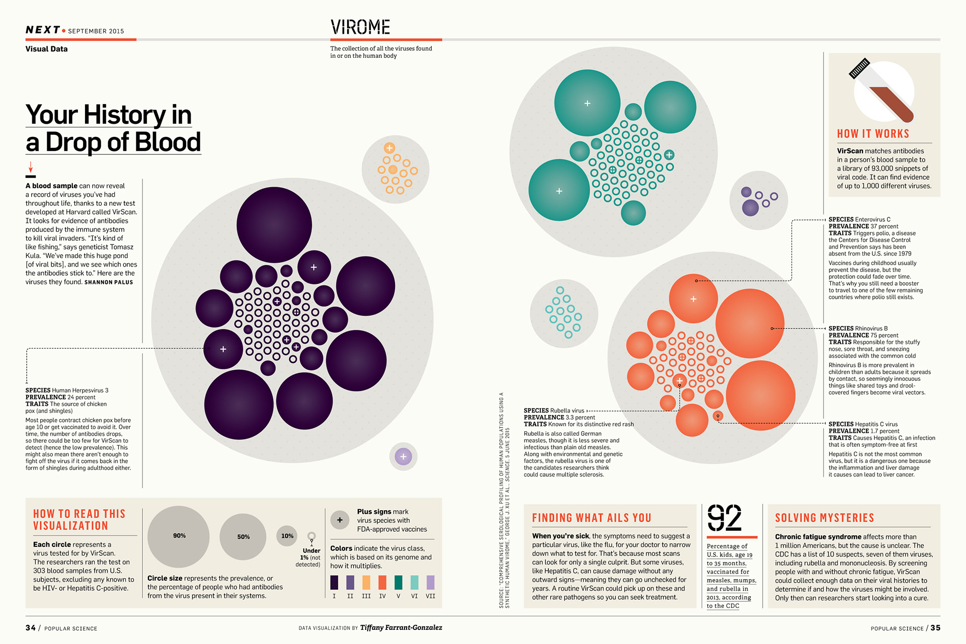 A blood sample can now reveal a record of viruses you've had throughout life thanks to a new test developed at Harvard called VirScan. Each circle within the visualisation represents a single virus tested for by VirScan, the size shows its prevalence or percentage of people who had antibodies from the virus present in their system.