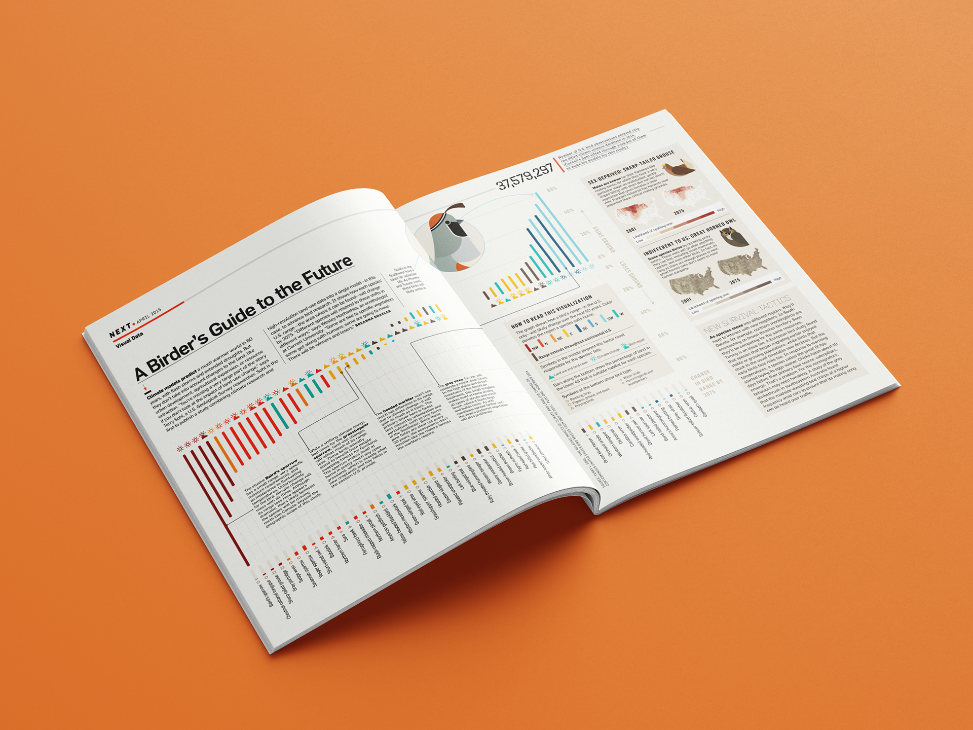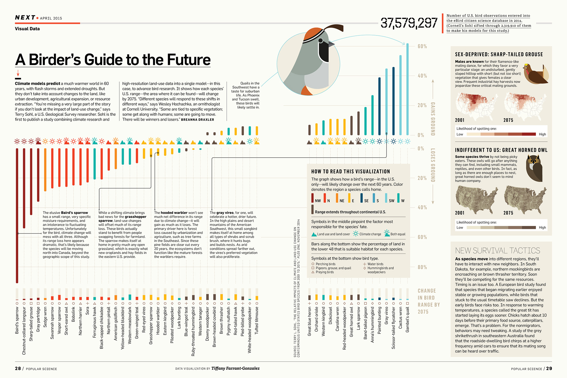 This graphic created for the April 2015 print edition of Popular Science magazine, visualizes how land-use and climate change are impacting bird life across the USA. The increase / decrease of a bird's range is plotted alongside the main driver behind this change (e.g. climate, land-use), the region in which the bird primarily resides and the total percentage of land in the US suitable for each species. (Region maps by Katie Peek)
